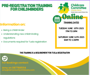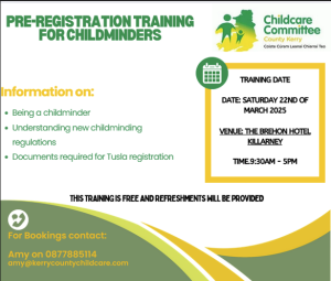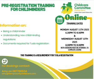 To reserve your place please contact Amy on 087 7885114 or email: amy@kerrycountychildcare.com.