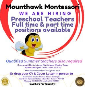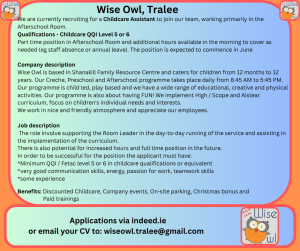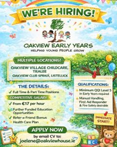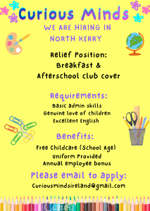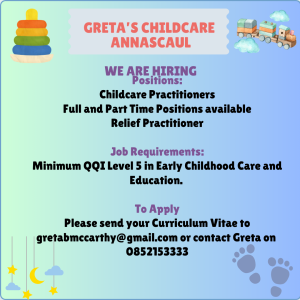 If you would like to advertise an upcoming vacancy or require support around recruitment and HR in your service, please contact Kathryn O’Donnell via email kathryn@kerrycountychildcare.com. For all vacancies please remember to include: the title of the position, duties involved, qualifications required, and experience needed for the role, preferred method of application and contact details, as well as the closing date for applications . (Positions advertised will end after 30 days unless specified).
